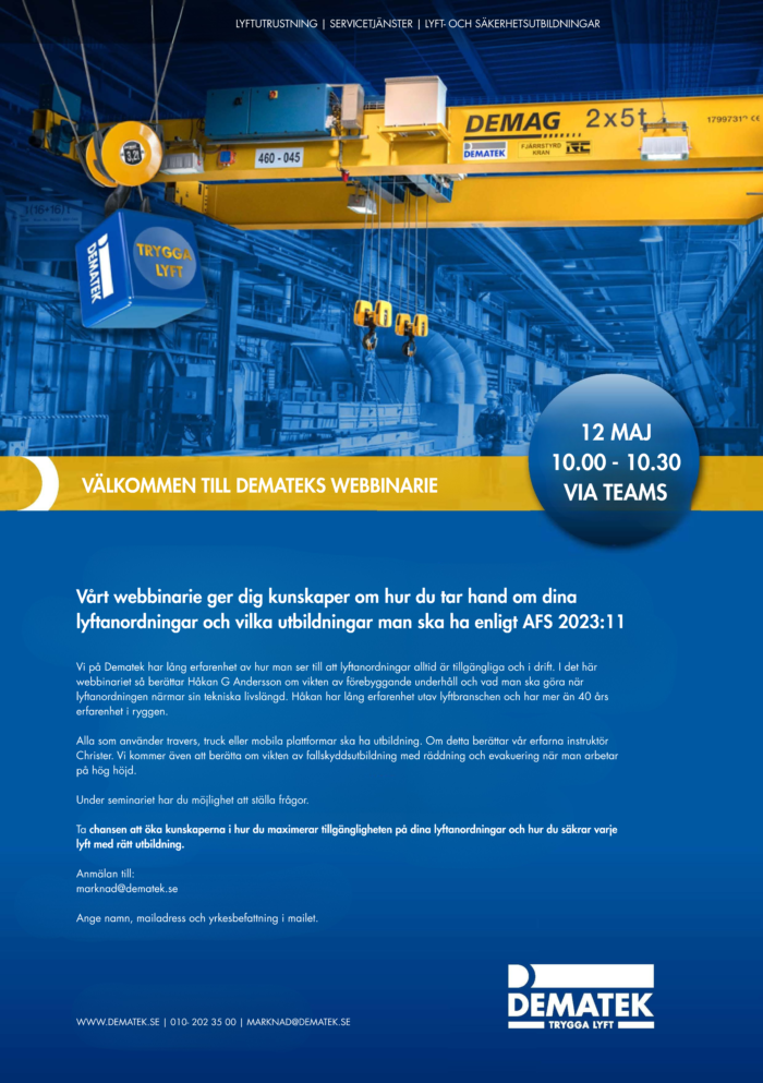 Dematek bjuder in till ett webbinarie den 12 maj klockan 10.00 – 10.30. Här bjuder vi på kunskaper om hur man bäst tar hand om sin lyftanordning och vilka utbildningar som man måste ha. Vi kommer att prata om travers- truck och utbildning för mobila arbetsplattformar samt fallskyddsutbildning med räddning och evakuering.