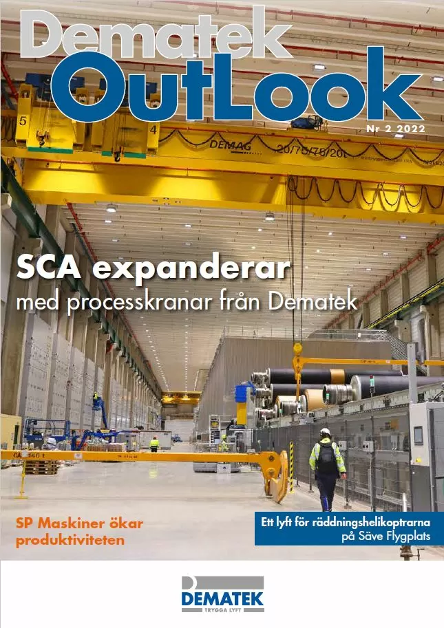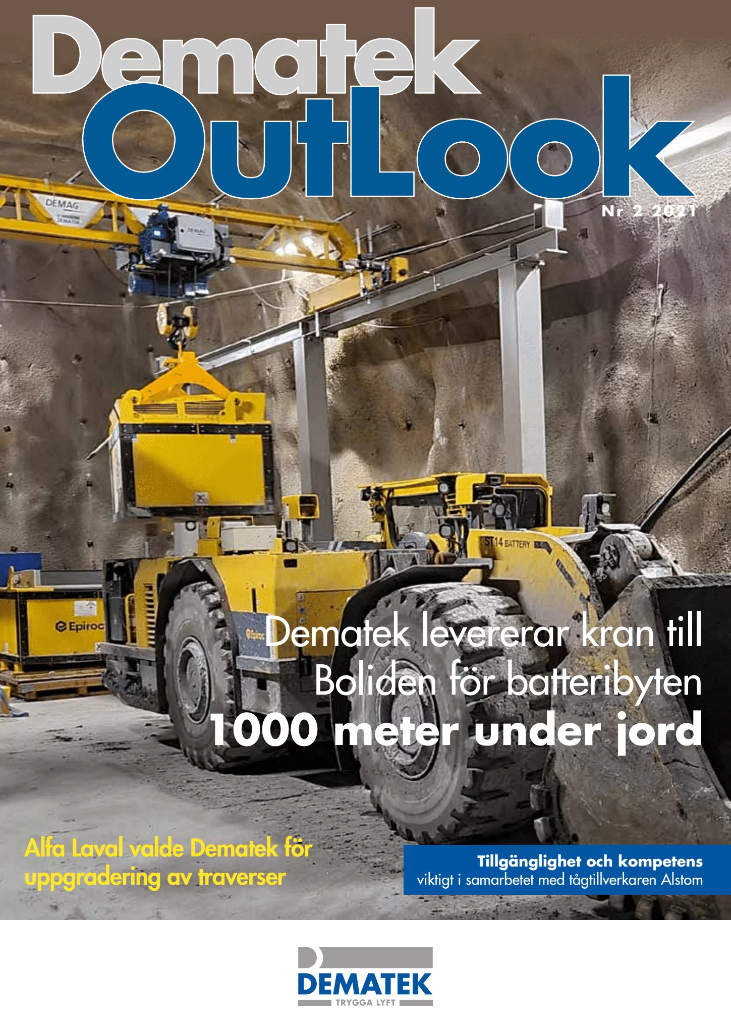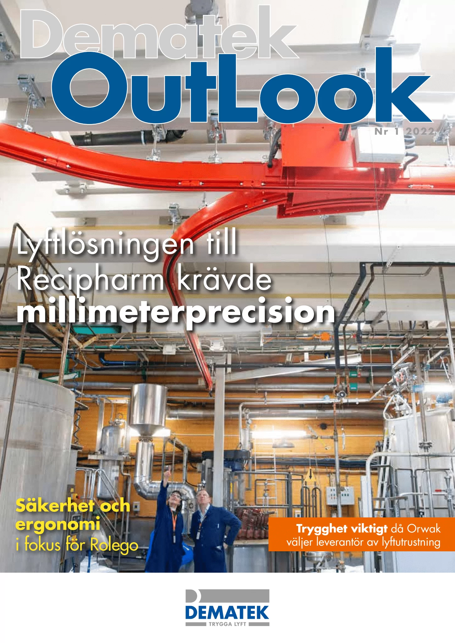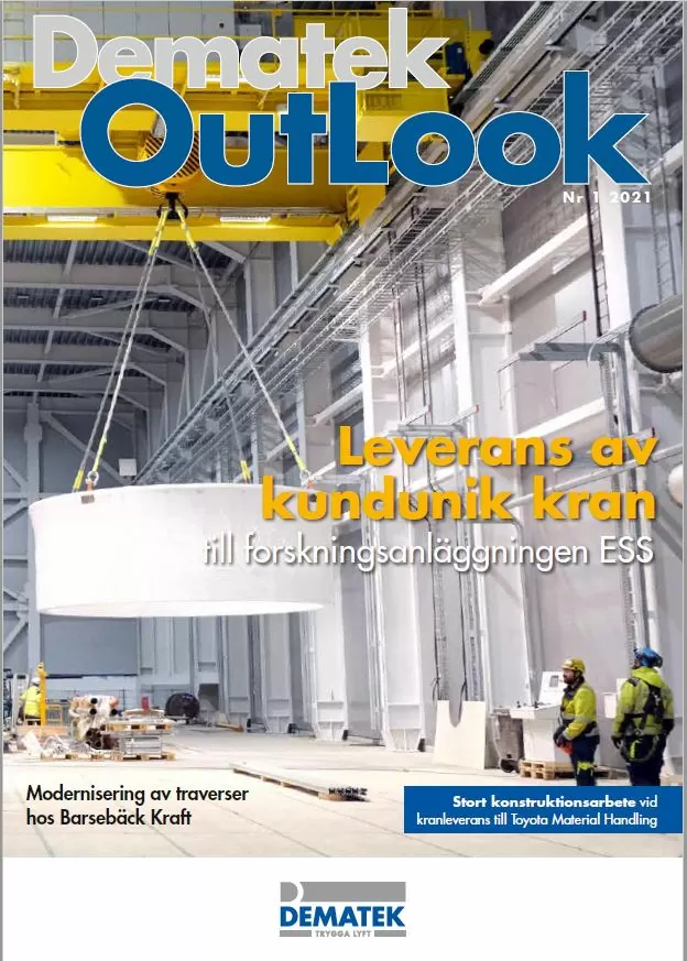 Välkommen att ladda ner Dematek OutLook. I Dematek Outlook lyfter vi fram några av de spännande leveranser vi gjort under året. I detta nummer besöker vi IV Produkt i Växjö som valde lyftutrustning från oss till sin expansion. Vi får också en inblick i den lite speciella verksamheten hos Cyclife i Nyköping där de hanterar metall från kärnkraftverk och andra kärntekniska anläggningar. Vi hälsar även på hos Outokumpu i Torshälla dit vi levererat ett avancerat lastupptagningsdon, med vridbar krok.
