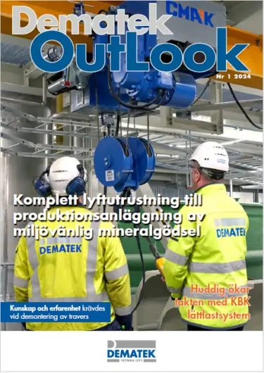 Allt fler företag upptäcker fördelarna med Dematek, såväl vad gäller produktutbud som vår kunskap kring trygga lyft. Detta nummer av Dematek OutLook speglar på ett bra sätt bredden i vår verksamhet,