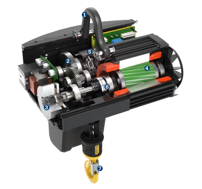 Hela drivlinan på telfern är konstruerad för lång livslängd och effektiv krandrift. Lyftmotorn, med polväxling i förhållandet 4:1, är konstruerad för 300 växlingar per timme vid en arbetscykel på 60%. Tvåstegsväxellådan på telfern eller, när det gäller storlek 10, trestegsväxellådan möjliggör säker kraftöverföring. Förutom den patenterade slirkopplingen garanterar den nyutvecklade bromsenheten maximal driftsäkerhet och tysktillverkad kvalitet.