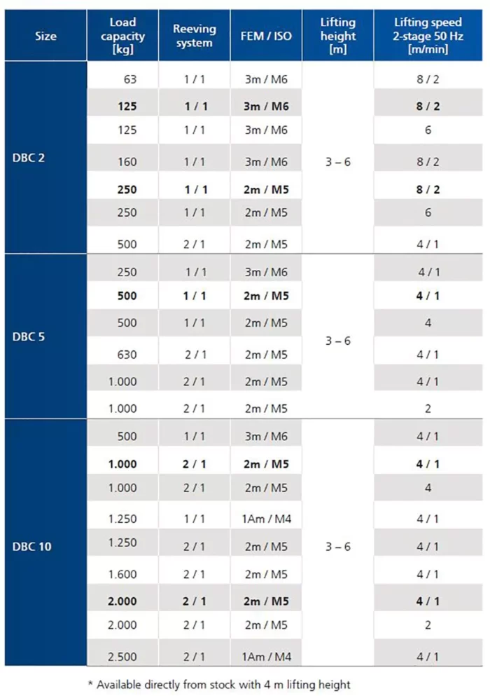 Tvåstegslyfthastigheten är upp till 8 m/min, medan en enstegsvariant kompletterar sortimentet. Storlekarna 5 och 10 kan också utrustas med en driftstidsräknare som tillval. DBC är lätt att installera med ett upphängningsfäste. Fast upphängning finns tillgänglig för stationär användning. För vagnar med flänsbredder mellan 58 och 500 mm kan användare välja mellan de mekaniska varianterna PBU och RBU samt den elektriska vagnen EBU. Denna eldrivna version uppnår förflyttningshastigheter på 20/5 m/min.
